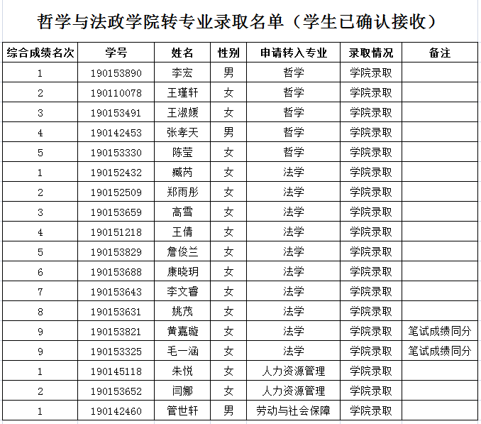 经转专业考试和考生网上确认,完场足球赛果 2019级转专业录取名单如下: