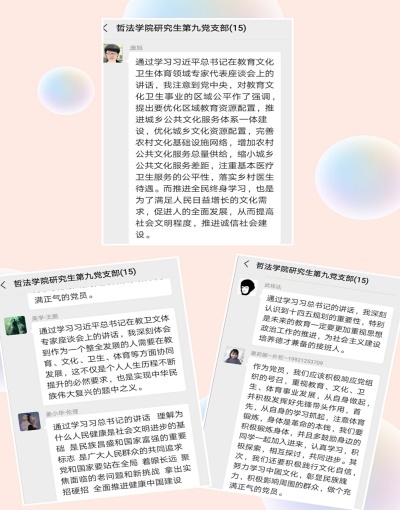 研9支部党员在支部微信群中激烈讨论,马文惠同学侧重关注了教育领域的内容,在肯定我国教育发展成就的同时,并对“十四五”规划中教育发展的新格局充满期待,她认为:“全面深化教育领域的综合改革有利于教育的系统化、整体化、协同化发展,中国人民整体思想文化素养会更上一层楼。”同样召开线上会议的支部还有本2支部、研12支部、研21支部等,线上气氛热烈。线下学习也不示弱,研7支部以交流座谈会的形式开展线下会议,支部党员积极参与,交流心得。周阿茜同学从党员学生的实际行动出发,谈到:“作为学生党员,一方面,我们要坚持做好学生本职工作,提升自身专业素养,另一方面,我们要勇于实践,培养自身的社会责任感和实践能力。”本3支部采用线下学习与线上讨论相结合的方式,深入浅出,达成共识,认为“作为学生,要脚踏实地,全面发展;作为学生党员,更要发挥模范带头作用,为祖国昌盛付出自己的一份绵薄之力。”研11支部从学生立场深度剖析讲话精神,支部党员唐靖雯从自身出发,对自己提出四点要求:“一,用知识武装自己,全面发展;二,学习中华传统文化,培养文化自信;三,注意个人卫生,配合防疫工作;四,加强体育锻炼,增强身体素质。”通过支部会议上的学习,各位党员纷纷表示加深了对习近平总书记讲话精神的了解,也更加明确了今后的努力方向 。