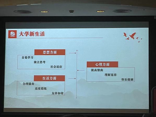谈到师德,朱教授提出,师德,是道之所存师之所存也。大学生应做好学问,为国家和社会做贡献,讲实话,做实事,以良心处世。朱教授认为,健康人格与心态有关系,青年学子需要以丘壑化为胸怀,容纳喜怒哀乐。在困境面前,需要有迟钝力,把复杂问题简单化。朱教授为新生适应大学生活提出建议,思想方面,应该自觉学习、独立思考、适应社会;生活方面,要合理膳食、适度锻炼、友善和谐;心理方面,则应当提高情商、理解宽容、快乐健康。