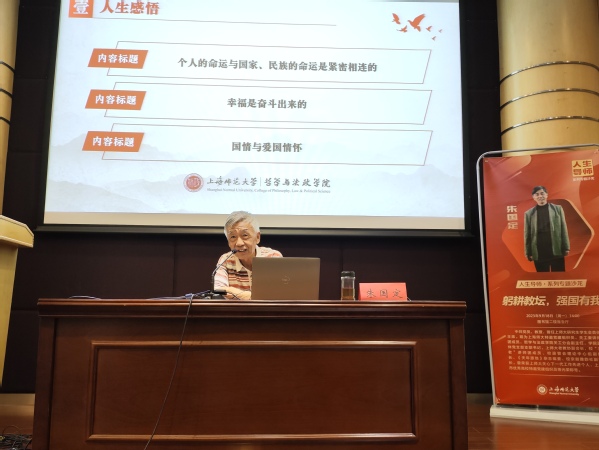 本次讲座的主题是“躬耕教坛,强国有我”。朱国定教授先介绍自己的求学经历,以自己充满坎坷但不断向上的人生经历,帮助同学们深刻了解到,国家各个重要的发展阶段与个人的人生发展际遇是紧密相关的。朱教授呼吁哲法学子要为国家富强、民族振兴、人民幸福做出自己的贡献。朱教授认为奋斗是持续的过程,他提出,大学只是一张带你进入下一阶段的火车票,之后的旅程中仍然会有很多竞争者。