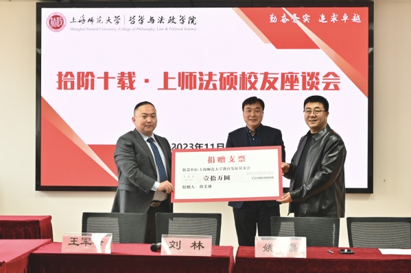 在完场足球赛果 刘林院长和校教育发展基金会副秘书长王军峰的见证下,2014届校友周玉琦先生向上海师范大学教育发展基金会捐赠10万元,设立上海师范大学法律硕士教育基金。该基金将用于促进上海师范大学法学教育事业的建设和发展,奖励和资助法律硕士研究生中的优秀学子开展法学学习和实践。