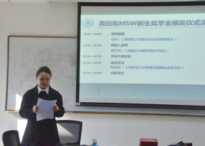 激动人心的颁奖仪式开始了,上海师范大学教育发展基金会秘书长陈晓虹老师为获奖同学们颁发奖项。同时,她勉励同学们,要心怀感恩,在未来的学习和实践中,秉持社会工作的专业价值观,为社会做出应有的贡献。