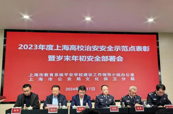 2024年1月17日下午14:30,上海市“2023年度高校治安安全示范点表彰会暨高校安全保卫工作会议”在上海高恒大厦召开,上海市教育卫生工作委员会副书记、上海市教育委员会副主任 闵辉,上海市公安局文保分局党委书记、局长何明,上海市教育委员会学校后勤保卫处处长张旭,上海市公安局文保分局党委委员、副局长曲东,上海市教育委员会学校后勤保卫处副处长黄峰,以及文保分局指挥室、政治处、治安大队、刑侦大队、各(属地)高校派出所所长,各高校保卫处处长出席,会议由文保分局副局长曲东主持。