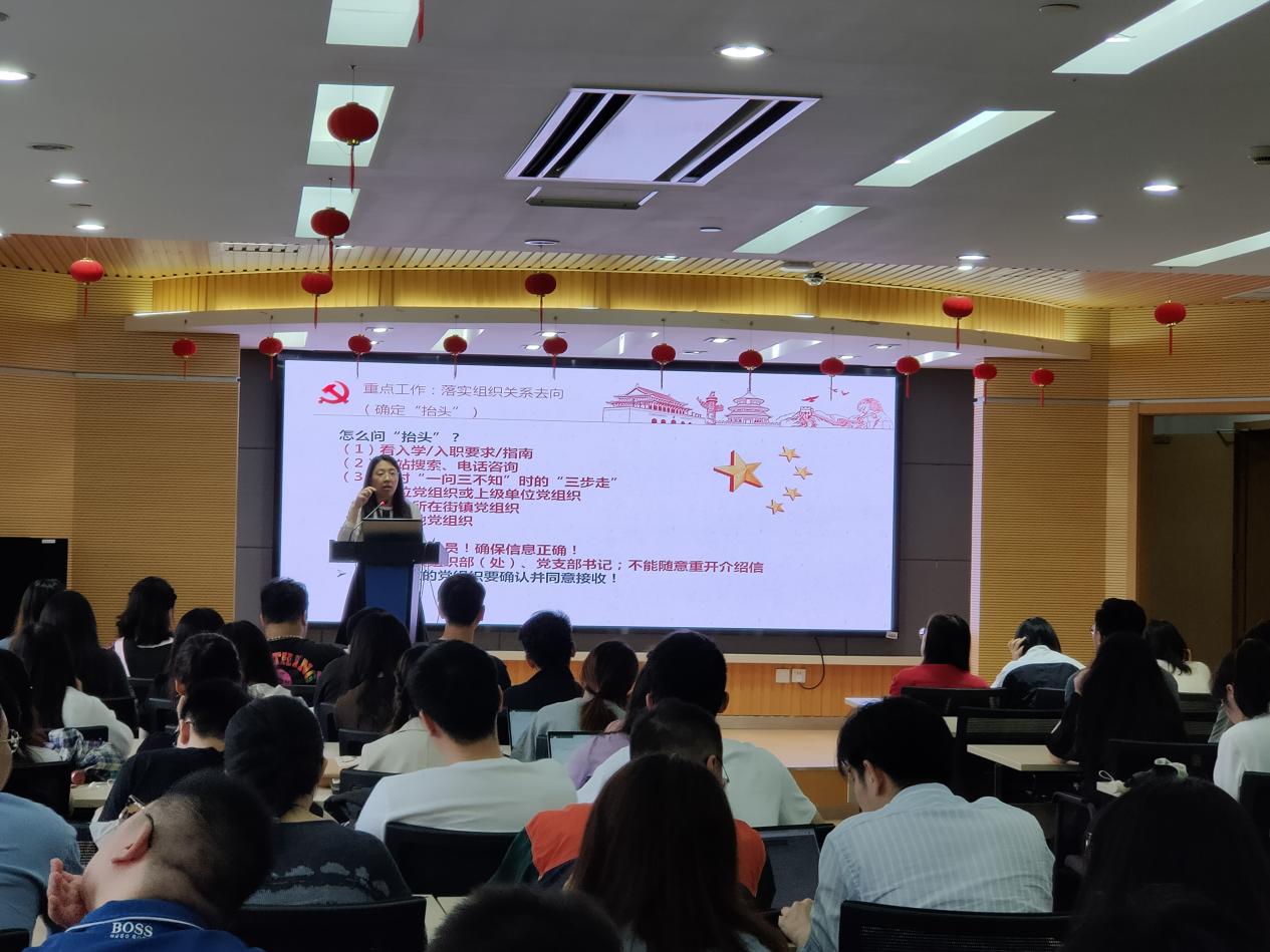 活动中,翁娜老师首先为全体毕业生党员带来了组织关系转接培训。主要分为四个板块,分别是“有关组织关系转接的规定”、“组织关系转接的排序原则”、“办理组织关系转移的基本流程”、“毕业生党员档案的转移”。根据《中国共产党党员教育管理工作条例》(以下简称《条例》),她强调党员应该增强身份意识和纪律意识,做到“讲政治、有信念”、“讲规矩、有纪律”、“讲道德、有品行”、“讲奉献、有作为”。在重点内容组织关系转接的排序原则部分,翁娜老师结合条例内容和毕业生去向分类,对到本市、外省、考研、工作、出国等不同情况的同学给予了具体的指导。另外,结合往年案例,她着重讲解了组织关系转接流程,为同学们提供了满满的干货建议。