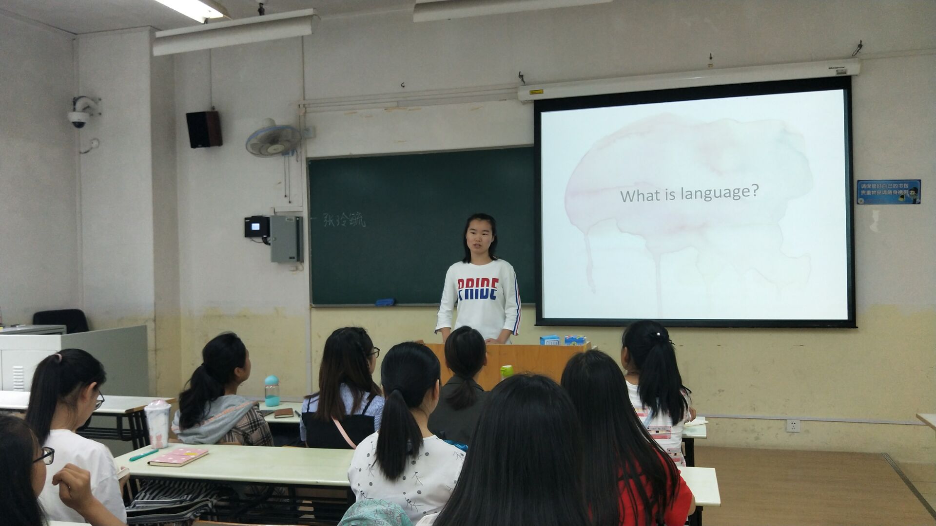 本次英语口语大进阶的主题为“what is language”。 在简单的自我介绍后,张老师以电影《神秘巨星》中的主题曲引入语言学习的话题,通过只是听歌和听歌看歌词的对比,说明语言学习需要眼手口并用。张老师和同学们交流学习语言的方法时,同学们开始都很害羞,在老师的趣味引导下都积极踊跃地说出自己的想法和自己学习语言时的感受,课堂氛围轻松活跃。之后,张老师以英语为例,和大家讲述目前世界上通用的英语语言。英语的口语主要是英音和美音两种,她通过一个表格就简单明晰地展现了英音和美音的单词区别、通过电影片段展示直观地展示了英音与美音的发音区别。在知晓了两者的种种区别后,张老师以日语、汉语等亚洲语种作为比照,向同学们介绍一个英语单词的学习要考虑其音节、重音、声调、节奏等多种因素,只有这样才能更加熟练地掌握进阶式英语。