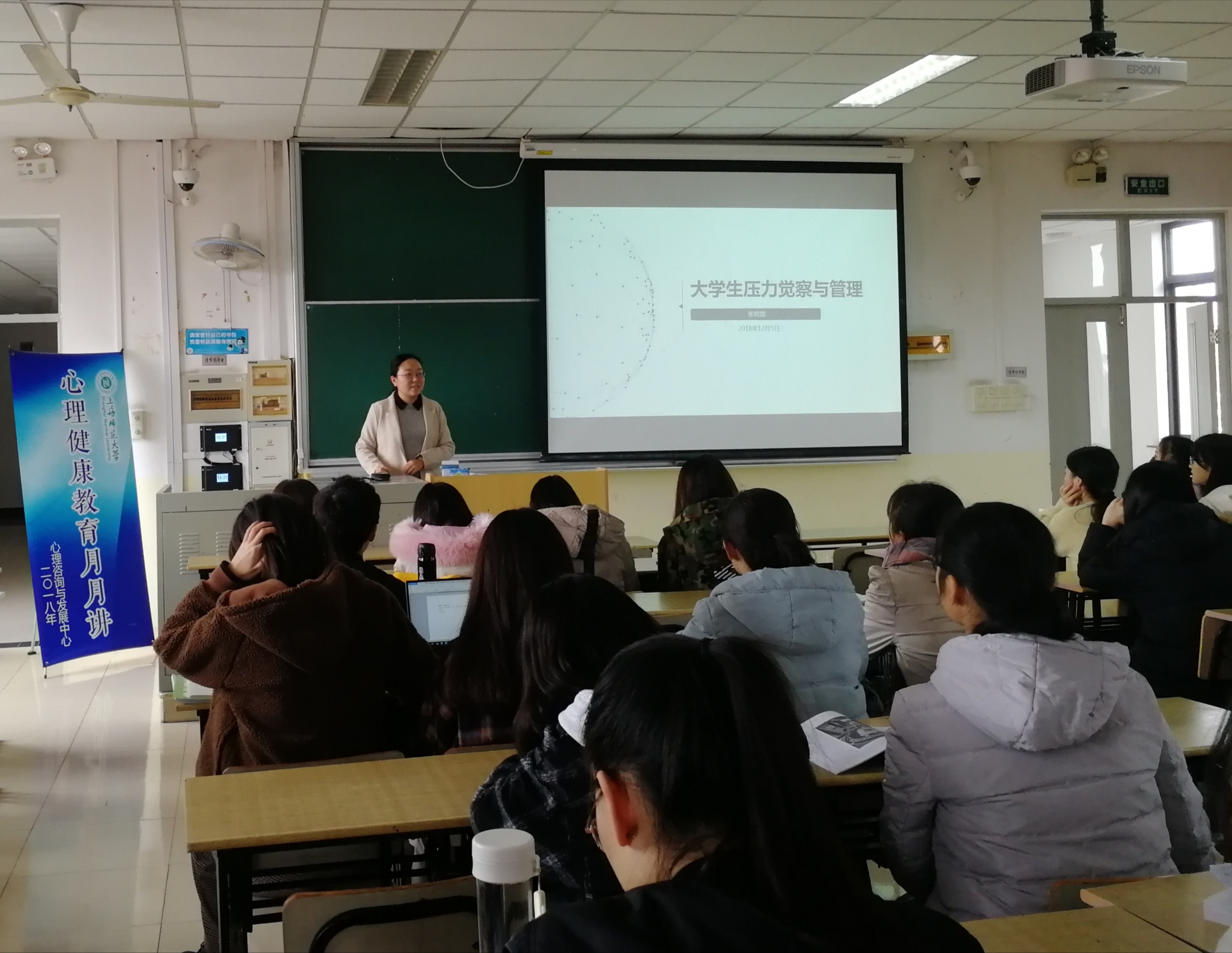 12月5号下午,由校心理咨询与发展中心主办,完场足球赛果 承办的以“大学生压力觉察与管理”为主题的心理健康月月讲在奉贤校区四教A519举办。本次讲座由哲法完场足球赛果 心理辅导员张晓雷老师主讲,哲法完场足球赛果 各年级学生积极参与。讲座开场,张老师以风趣幽默的方式对最近同学们可能遇到的压力进行了简短的引入,引起了大家的共鸣。