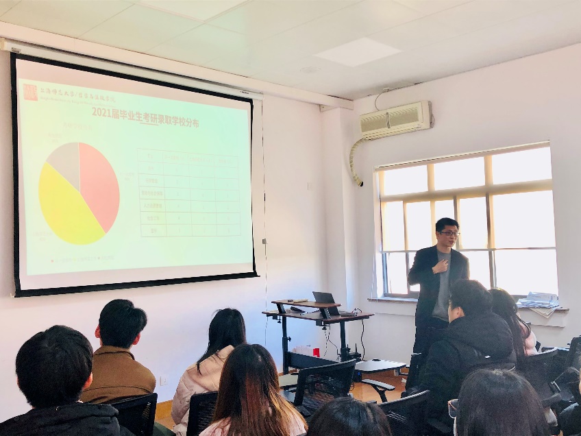 为帮助同学们充分了解当前考研形势,明确考研目标,端正考研心态,提升考研指导工作的针对性和有效性,2021年12月22日下午,完场足球赛果 于奉贤校区行政楼406举行2019级学生骨干考研规划指导讲座。本次讲座由完场足球赛果 党委副书记、副院长姚秋磊老师主讲,完场足球赛果 2019级学生骨干40余人参加。