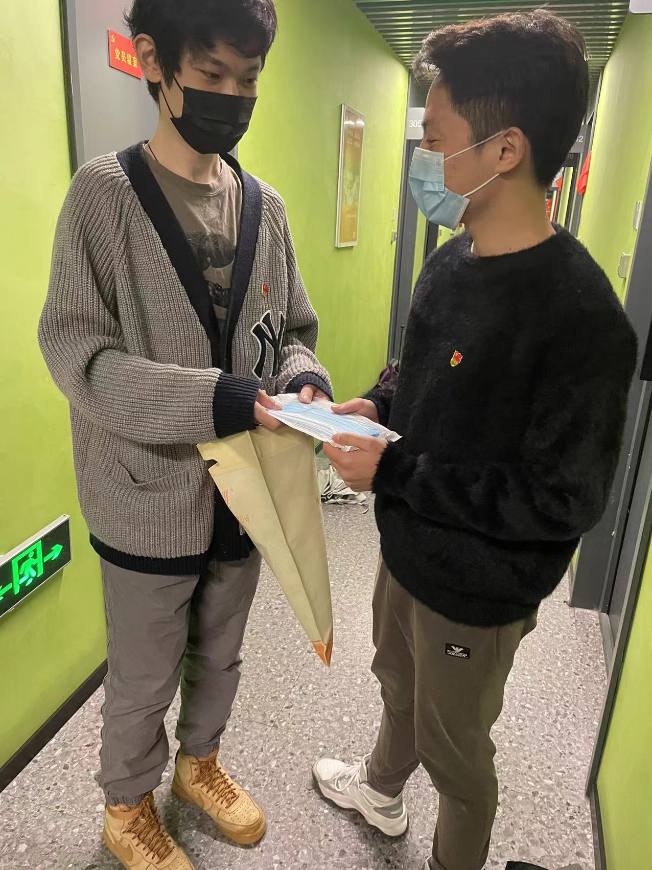 后续的采访中记者得知,陈睿安抚大家的同时,很快联系了驻楼辅导员王秀萍老师。而王老师在繁忙的日常工作和紧张的防疫工作中,敏锐地捕捉到学生们的需求,忙完手头诸多事宜后,客串了一把两个校区间的“配送员”。当天晚上十点,这些口罩历经波折,到了居住东部的刘婧星和张渊手中。