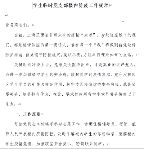 各临时党支部坚持“线上学习+线下防疫”两手抓,不仅确保疫情防控不放松,而且保障组织生活不断线。各临时党支部始终严格落实组织生活制度,积极有序开展线上党组织生活会,筑起党支部战斗堡垒。同时设立多个临时党小组,进一步完善“临时党支部-楼层党小组组长-宿舍