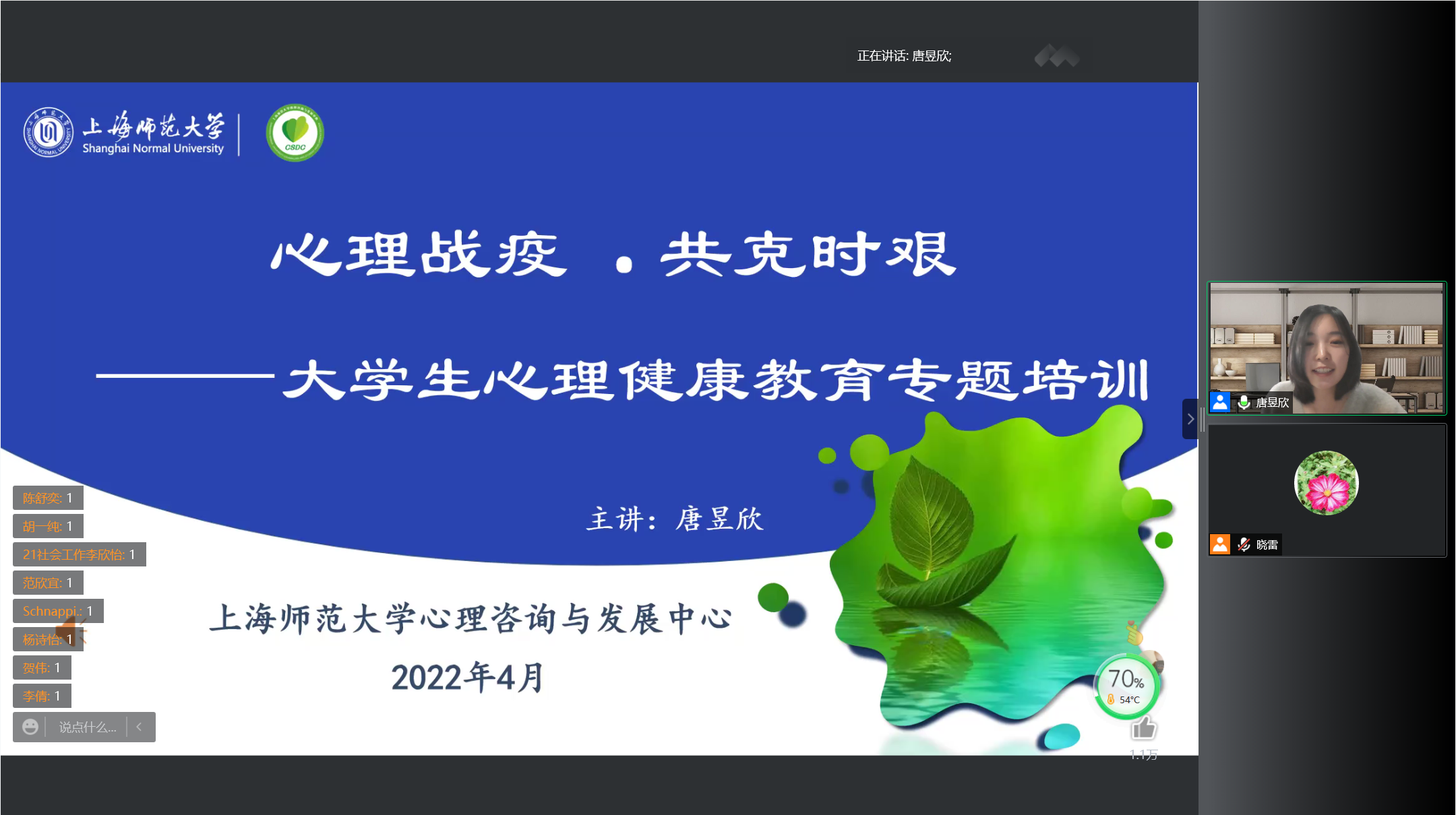 为营造良好校园氛围,舒缓学生心理压力,2022年4月29日13:00,完场足球赛果 “心理战‘疫’,共克时艰”大学生心理健康教育专题培训通过腾讯会议顺利举办,校心理咨询与发展中心的实习心理健康教师唐昱欣担任主讲,约1000名学生共同参与。