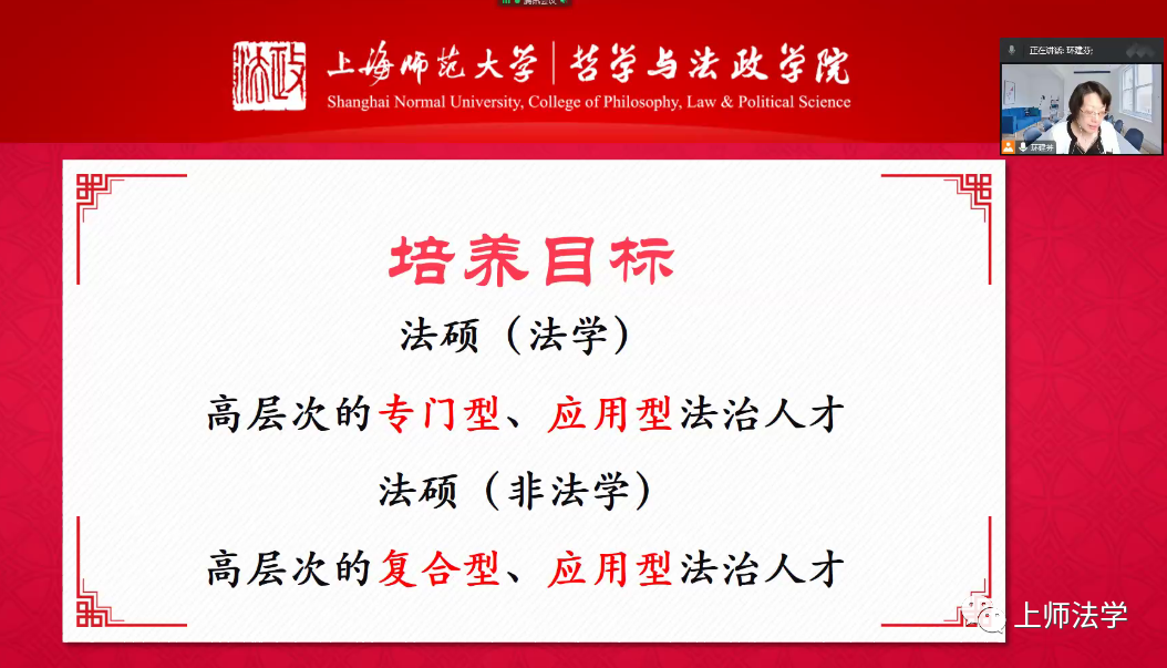 见面会的第二阶段,是法律硕士教育中心培养方案和管理机制解读。环建芬老师向同学们介绍了上海师范大学法律硕士的培养方案、培养目标、学科设置、课程考核以及各学期的基础性安排。她着重强调了学习态度的重要性和学术不端的危害性,鞭策同学们严格要求自身。