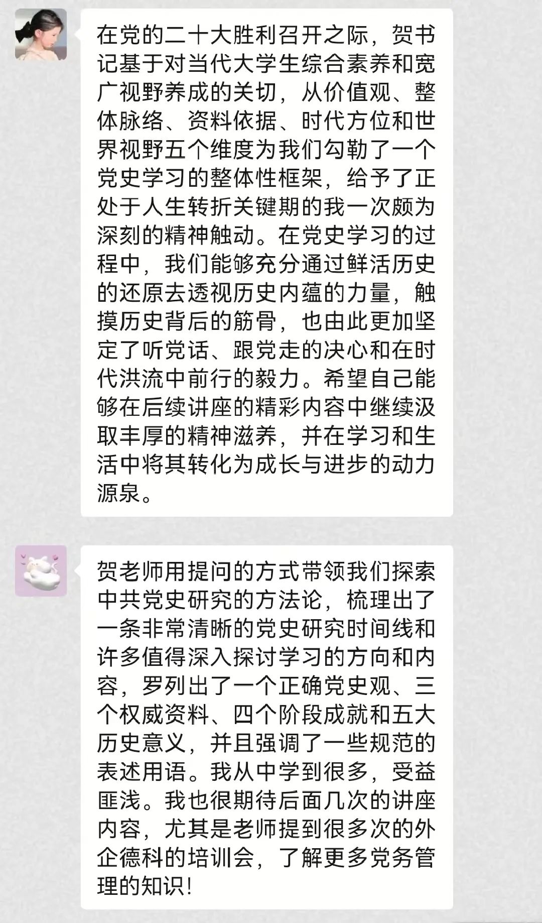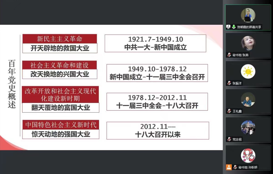 贺朝霞老师强调,对本次参赛同学来说,接受党务知识培训是系统学习党内法规、了解党务管理实务、提升党务管理能力的难得机会。她希望学生党员、入党积极分子等不仅学好本专业,而且具备党务管理能力,为胜任复合型岗位而做好准备。为帮助学员更好地学习党史知识,贺朝霞老师以《中共中央关于党的百年奋斗重大成就和历史经验的决议》等为依据,阐述了党的发展史,以设问的方式提纲挈领地展示了重点,并给出了中肯、专业的学习建议。