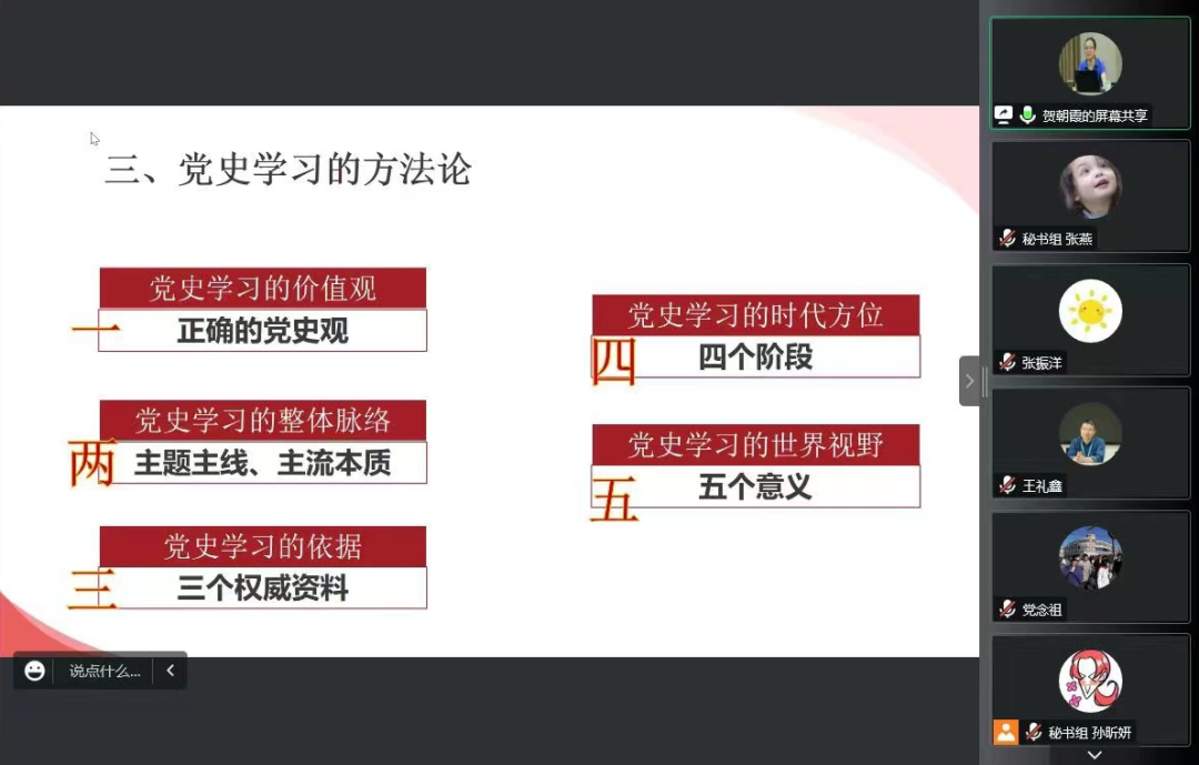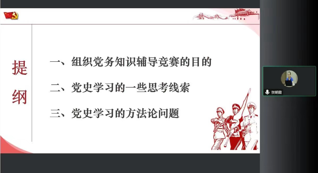 贺朝霞老师以“中共党史学习的方法论问题”为题,报告包括三个部分:一是组织党务知识培训与竞赛活动的目的;二是党史学习的一些思考线索;三是党史学习的方法论问题。