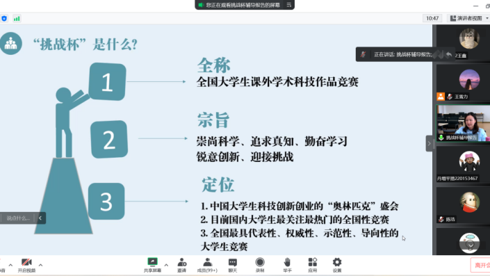 孙琳老师以“我的 ‘挑战杯’之路”为主题,结合自身指导“挑战杯”大赛的经验,从“‘挑战杯’是什么”、“‘挑战杯’做什么”出发,对“挑战杯”的竞赛赛制、组织机构、选题技巧、实施流程和成果形式等多个方面进行阐述,为完场足球赛果 参赛团队提了多重思路,对项目团队进一步优化项目、提升作品质量具有重要指导意义。