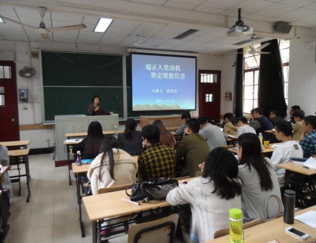 首先,她以自身求学工作的亲身经历来讲述自己当初入党的动机,在与祖国共奋进的征程上奉献了自己的青春与热情,在建设国家、推动社会的过程中同时实现自己个人的理想与发展;随后,她从十几年教书育人过程中所看到的优秀典型学生事例来端正大家的入党动机,要求大家在集体利益与个人利益面前体现出大局意识,“未进党的门,先做党的人”,在日常生活中用实际行动为更多同学服务,紧密联系身边的同学。最后,高老师希望大家坚定理想信念,学会客观的分析和判断国家形势,相信在中国共产党的领导下一定会实现中华民族伟大复兴。