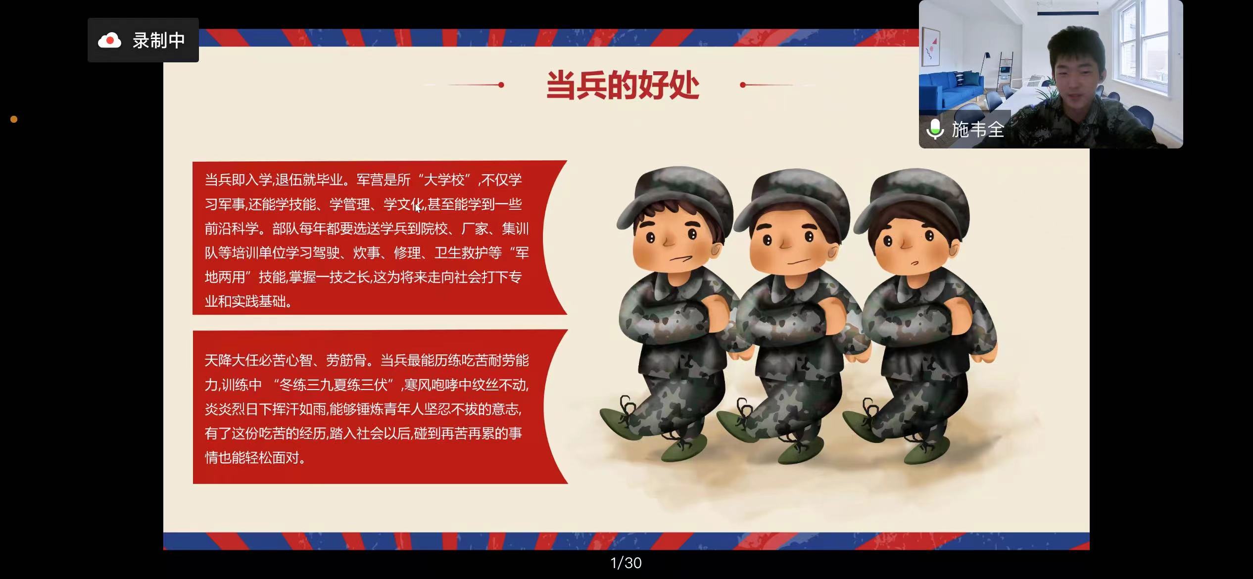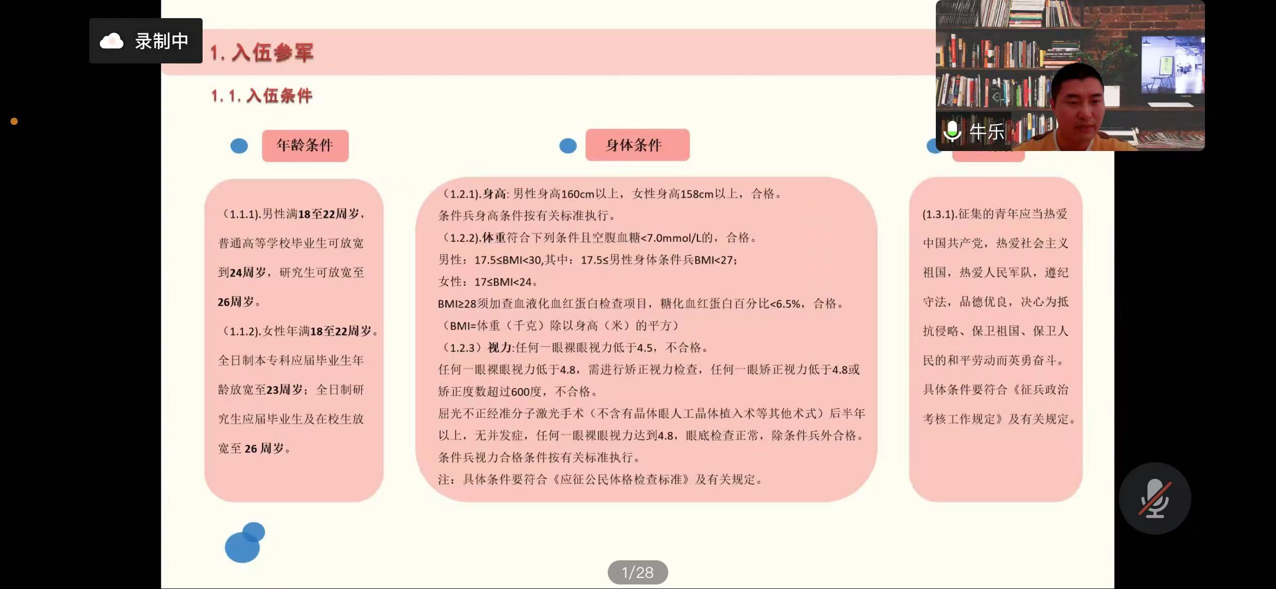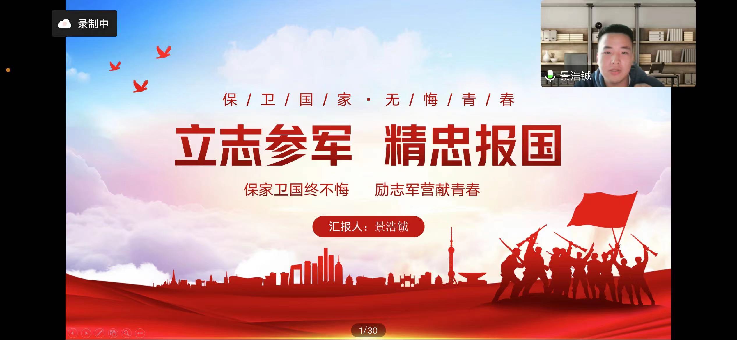 兼职辅导员牛乐详细介绍了参军入伍的条件及优待政策并告诉同学们要坚定入伍的理想信念,激励同学们在激流勇进中展示青春的风采。
