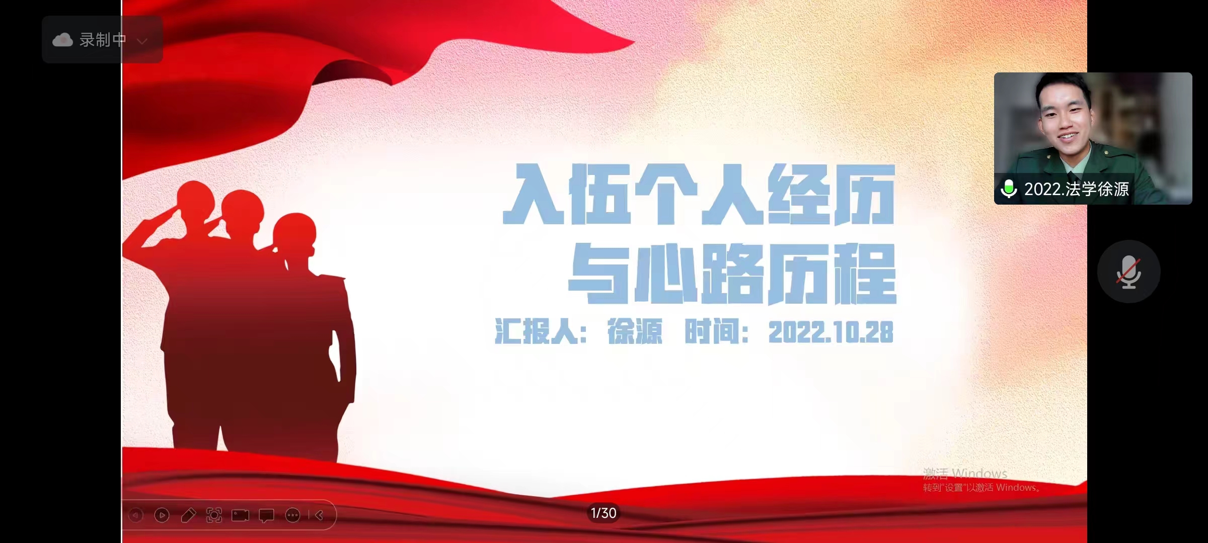 景浩铖、杨永政、施韦全及徐源四位退伍复学同学分别向同学们分享了自己的军旅生涯,向大家展示了军人真实的生活,阐述了大学生入伍对于自身塑造和锻炼成才的重要意义,提醒同学们想要穿上军装,就必须要承担起肩头的责任,承受住训练的痛苦,立志参军是一项无悔青春的事,号召大家积极参军入伍,投身国防建设,在军营中绽放绚丽青春。