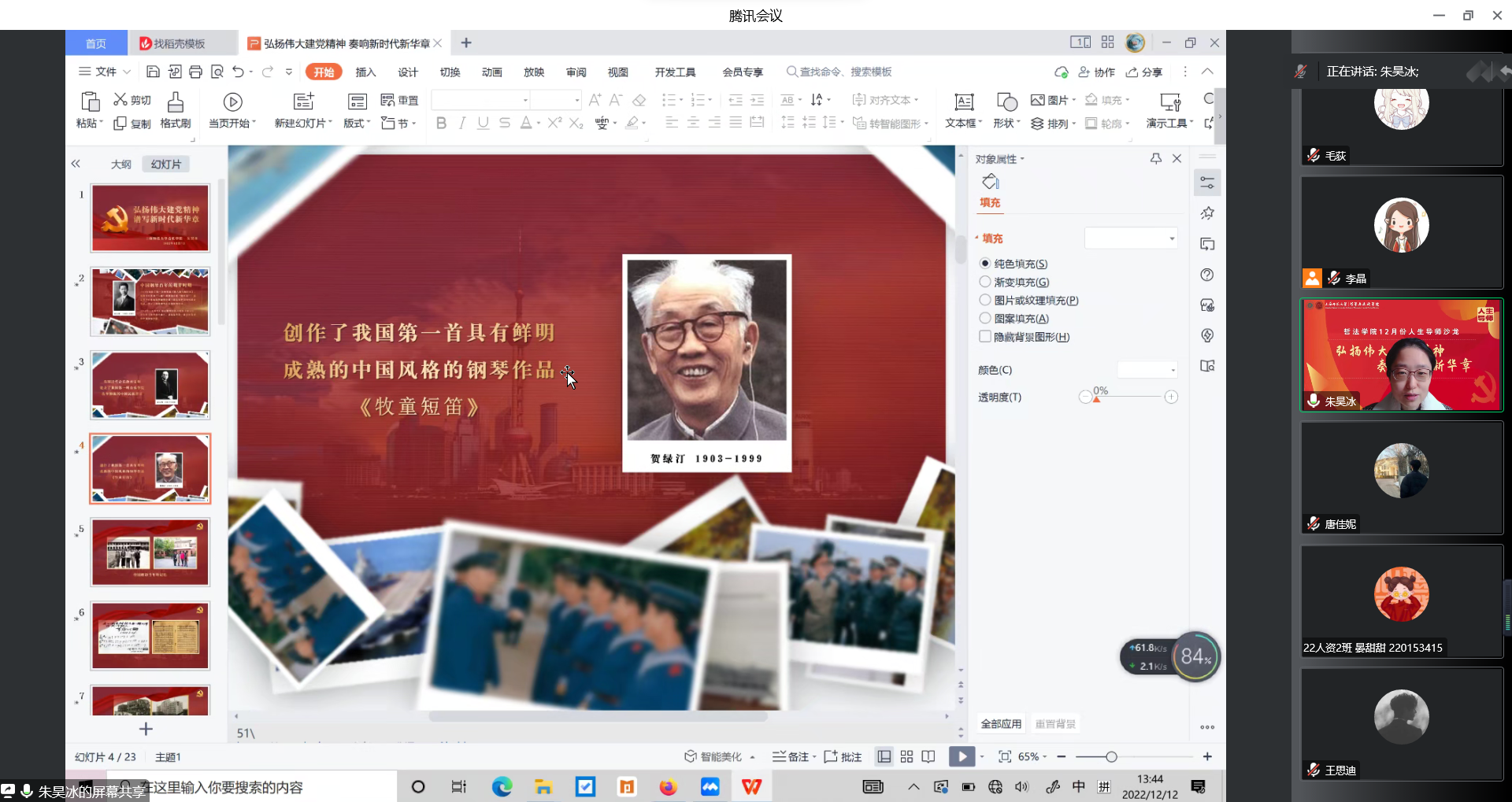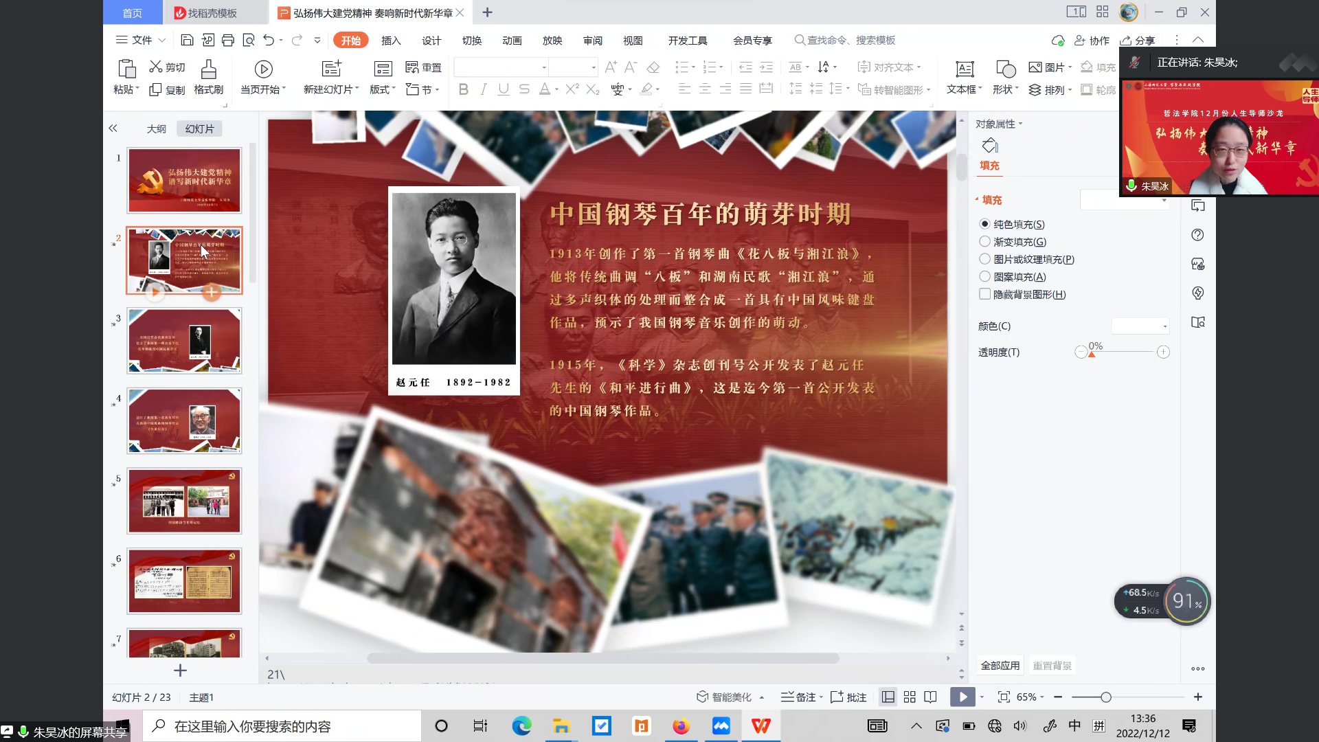 随后,朱老师以中国钢琴的百年发展历史为主线,穿插和展示了《游击队之歌》、《义勇军进行曲》、《红旗颂》、《长征交响曲》等经典红色音乐作品以及背后蕴藏的动人故事、家国情怀,串起了中国共产党惊天动地的发展奇迹。