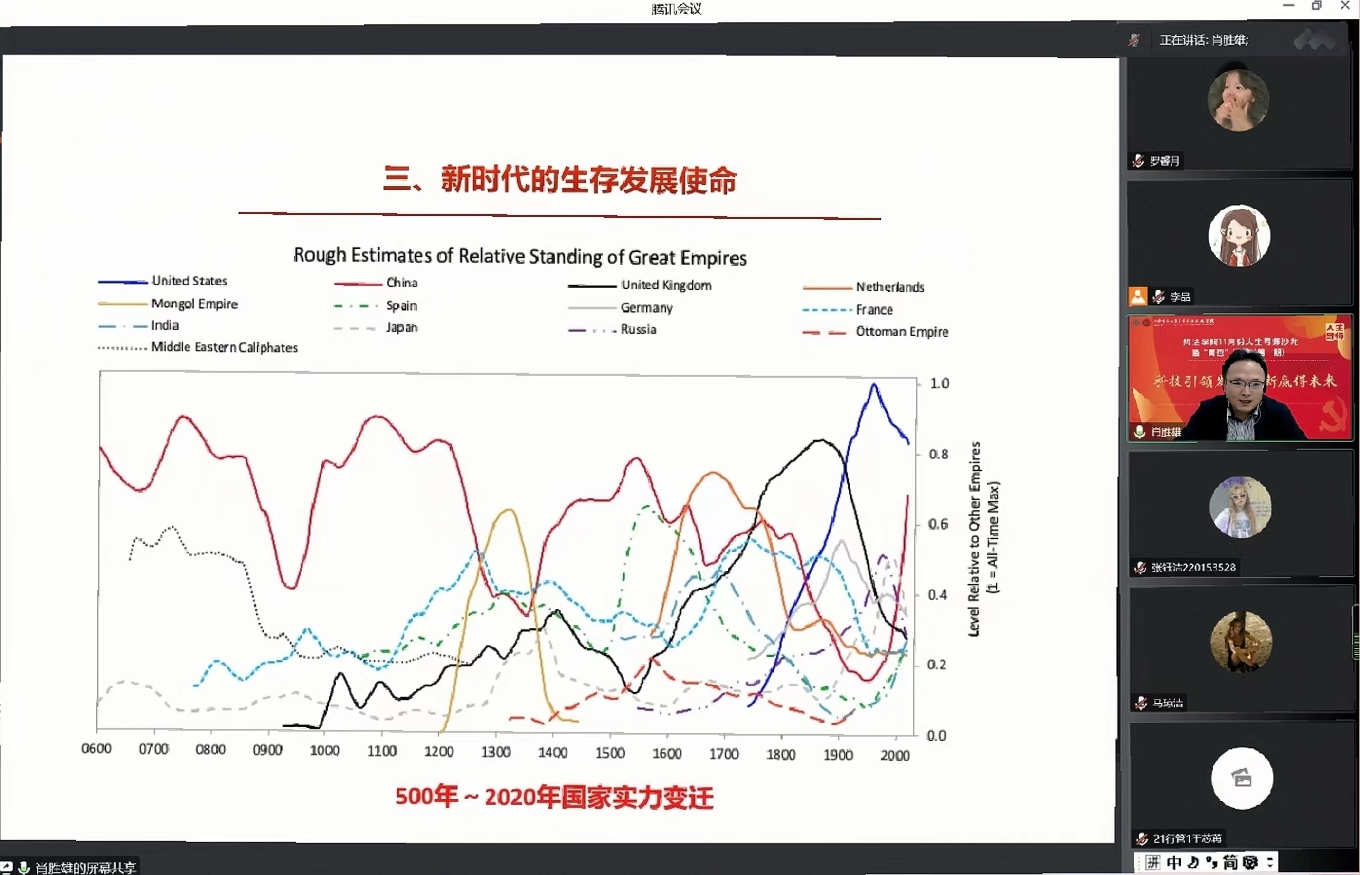紧接着,肖老师展示了近一千五百年来世界各国的国家实力变迁图,并借此阐述了中国波折的历史发展进程和新时代中国发展面临的一系列的问题。当前,面对风云变幻的国际形势,中国迎来新的机遇与挑战。一方面,伴随关键核心技术实现突破,战略性新兴产业发展壮大,中国进入创新型国家行列;另一方面,关键技术被发达国家“卡脖子”,阻碍了中国在高科技产业中崛起,使我们在新产品开发、新技术应用等方面面临诸多挑战。基于此,肖老师尤其强调了美国对中国经济崛起,高科技领域的战略遏制和“围猎”,他也展示了美国军事基地在全球的布局,揭示美国霸权思维方式和领导世界的野心。但肖老师也提出,伴随中国不断发展,中美间差距越来越小,未来,中国的综合实力一定会超越美国。