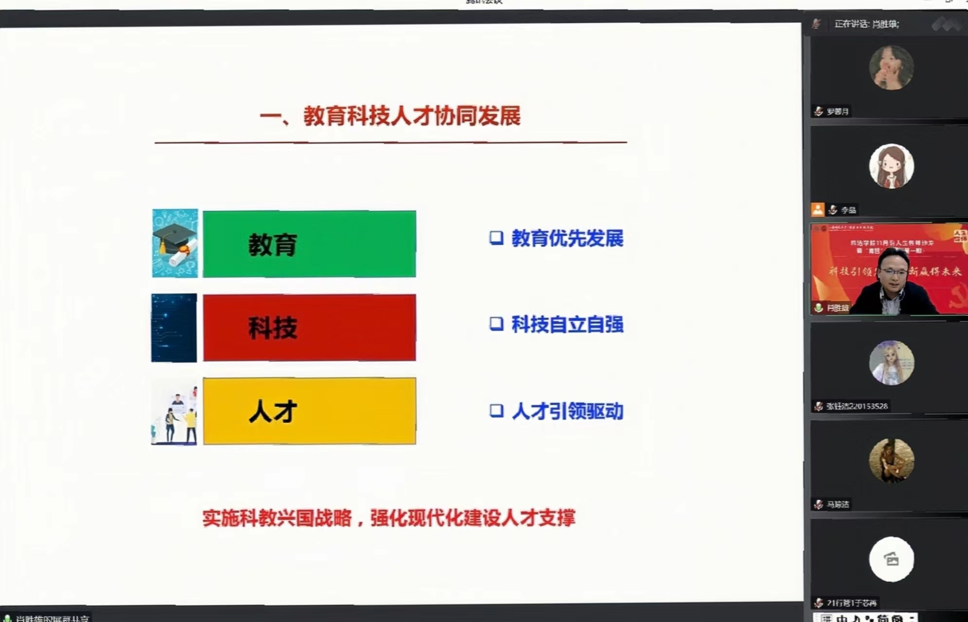 首先,肖老师以教育、科技、人才协同发展为切入点,指出教育、科技、人才是全面建设社会主义现代化国家的基础性、战略性支撑,要坚持教育优先发展、科技自立自强、人才引领驱动,深入实施科教兴国战略和人才强国战略,强化现代化人才支撑。同时,肖老师结合党的二十大报告解读了建设创新型国家的路径,并进一步强调了国家创新发展的必要性和重要性。