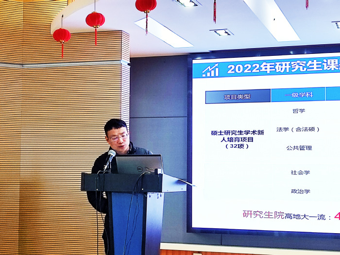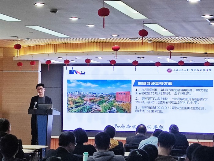 分管研究生工作的王礼鑫副院长介绍了上一年研究生论文发表情况和比赛获奖情况,他强调研究生导师是研究生教育培养的第一责任人,研究生导师要加强研究生培养过程管理,及时了解研究生的科研进展,对学生学位论文做到严格把关。要求导师提醒学生积极申报上海师范大学高水平地方高校建设一流研究生教育项目,强调二级学科导师要通过导学团队加强对研究生的指导。